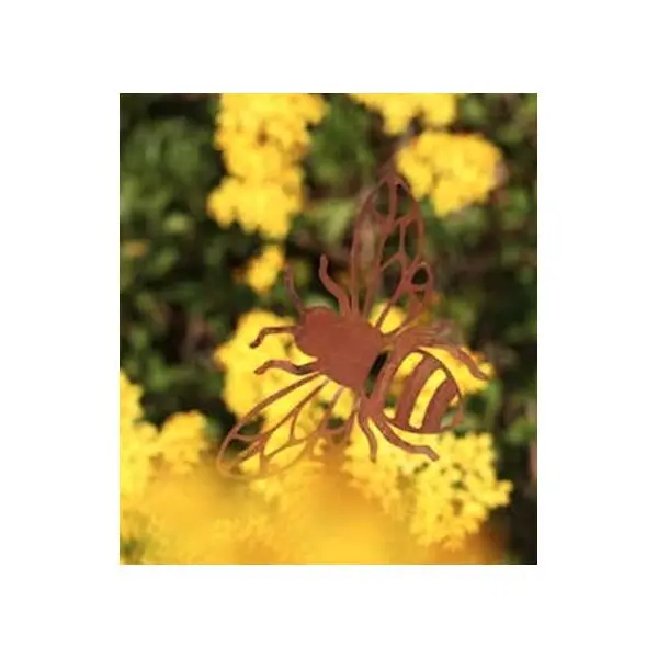 De prachtige bij met uitsijdingen is vervaardigd uit speciaal behandeld metaal met een roestige look en staat leuk aan de tuinmuur, bij het insectenhotel maar kan ook aan de muur in de keuken voor een leuke sfeer zorgen.