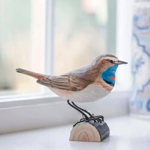 De blauwborst is een trekvogel met een opmerkelijk stemgeluid. Zijn heldere, levendige tonen hebben hem zelfs de bijnaam ‘de Noordse nachtegaal, opgeleverd. Deze houten zangvogel is een levensechte weergave van de mannelijke blauwborst. De opvallende blauwe keel met zijn roestrode plek is het belangrijkste kenmerk van deze vogel.