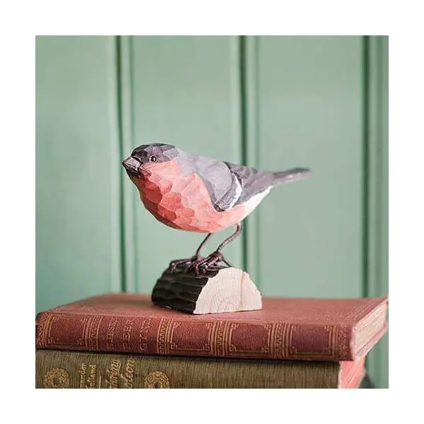 Goudvink ambachtelijk uitgesneden op ware grootte. De goudvink wordt geleverd in een mooie verpakking en met een stokje waarmee de vogel ter decoratie in een bloempot gestoken kan worden.