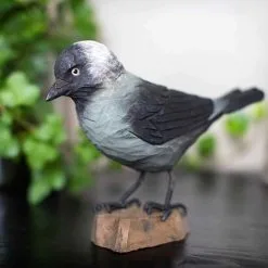 Ambachtelijk vormgegeven houten kauw (Corvus monedula). De kauw wordt op ware grootte weergegeven en is beschilderd met milieuvriendelijke verf. Deze grote antraciet gekleurde zangvogel is door velen geliefd en gehaat. Deze nieuwsgierige kraaiachtige heeft een zwartgrijs verenkleed en een zilvergrijs achterhoofd.