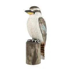 Ambachtelijk vormgegeven Kookaburra (Dacelo novaeguineae). De vogel wordt op ware grootte weergegeven en is beschilderd met milieuvriendelijke verf.