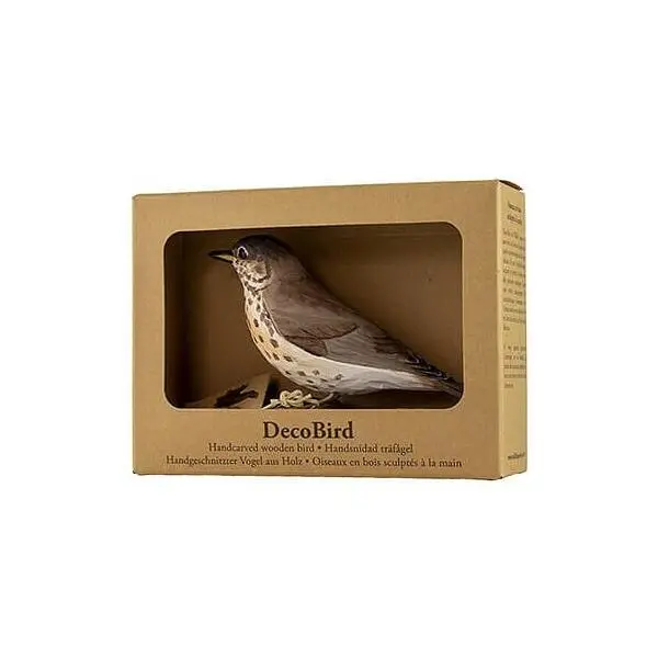 Ambachtelijk vormgegeven houten zanglijster. De lijster wordt op ware grootte weergegeven en is beschilderd met milieuvriendelijke verf.