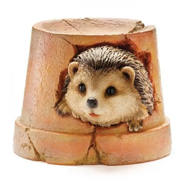 Egel piet uit de bloempot om te loeren of de kust wel veilig is. Een leuke en decoratieve versiering die prachtig staat tussen de tuinbeplanting of op het terras.