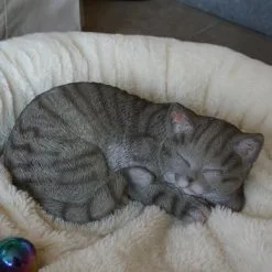 De slapende kat is gemaakt van kunsthars en is verkrijgbaar in 3 kleuren: een zachte oranje-bruine kat, een gevlekte of lapjeskat en een grijze kat.