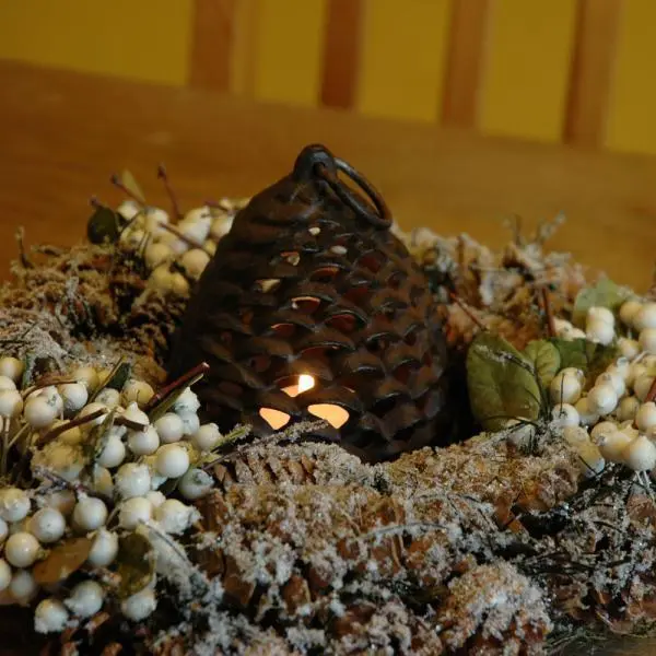Antiekbruine lantaarn voor sfeer op de terras- of tuintafel of binnen in de huiskamer. Deze decoratieve theelichthouder van gietijzer heeft de vorm van een dennenappel, dankzij de kleine openingen schittert het kaarslicht op een bijzondere manier.