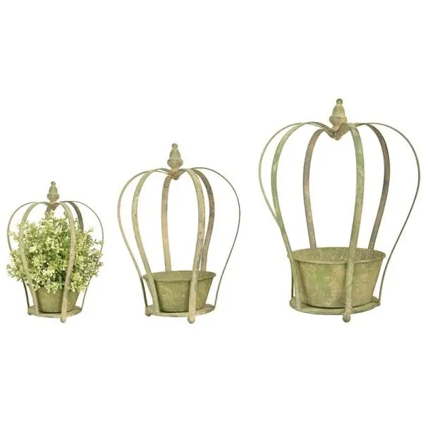 Leuke set van drie pothouders in de vorm van een prachtige Engelse kroon! De drie houders met potten hebben verschillende groottes en zijn afgewekt met een antieke groene patine zodat het lijkt alsof ze al jaren in de tuin staan. In de potjes kan je een kaars of een bloempot zetten.