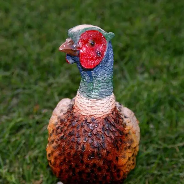 Dit prachtige beeld is weerbestendig geschilderd in waarheidsgetrouwe kleuren. Het staat prachtig in een tuin, park of bos tussen de beplanting en in huis bij elke liefhebber van de fazant. Dit beeld geeft alle typische kenmerken van de mannetjesfazant mooi weer: het opvallend gekleurde verenkleed, rode lellen en groene topjes aan de oren.