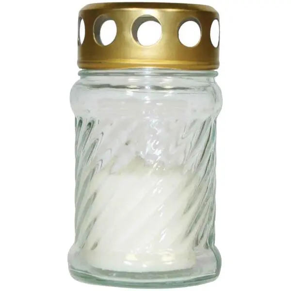Grafkaars met een brandtijd van 10 uren. De kaars wordt geleverd in een glazen houder die afsluitbaar is dankzij het metalen deksel. Zo blijft de kaars beschermd bij regen. In het deksel zorgen de openingen voor zuurstof zodat de kaars kan blijven branden.
