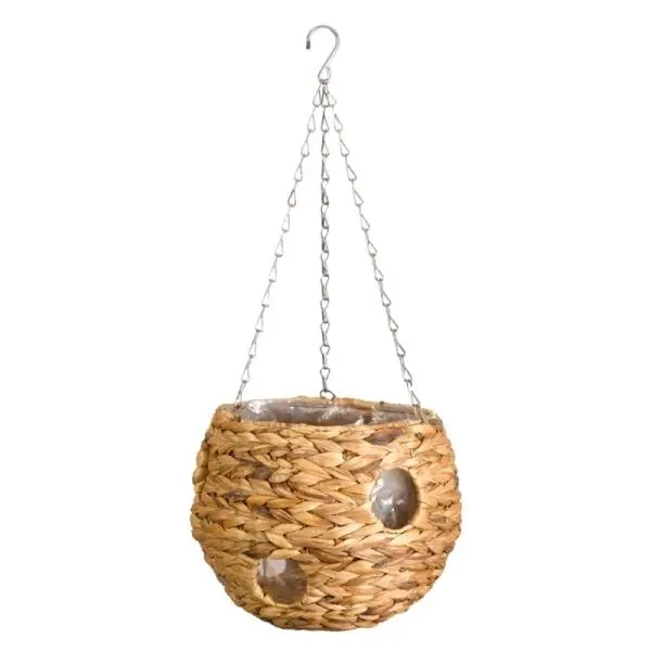 Bolvormige hangmand van natuurlijke vezels. De ronde mand met natuurlijke uitstraling heeft bovenaan een grote vulopening en rondom 6 plantgaten. Binnenin de mand beschermt een plastiek cover de natuurlijke vezels van de mand.