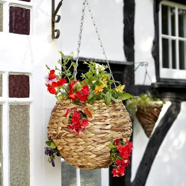 Vul de mand met potgrond en plant jouw favoriete hangplant of kuipplant in elke opening. Zo bekom je, mits wat goede zorg + water en mest op het juiste moment, een prachtige bloemenmand om heel de zomer van te genieten.
