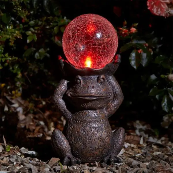 Deze lachende kikker ondersteunt een mooie lichtbol op zonne-energie. Deze tuindecoratie geeft overdag en ’s avonds een charmante sfeer aan jouw terras, patio, voordeur of plantenborder. De kikker is leuk gezelschap voor groot en klein en in het duister straalt de lichtbol een feeëriek licht uit. Geen elektrische voeding of bekabeling nodig want het zonlicht wordt door het zonnepaneel opgevangen en opgeslagen in interne batterijen. Dankzij de ingebouwde lichtsensor gaat de verlichting automatisch branden zodra het donker wordt.