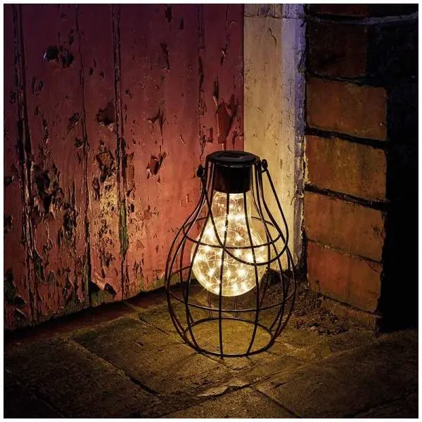 Een lantaarn met een bijzonder sfeervolle verlichting. De Eureka lantaarn heeft een vintage karakter en bevat twee lichtslingers met kleine sfeervolle led lampjes die net als glimwormpjes een warme gloed geven. De lichtslingers zitten in een grote glazen bol die lijkt op een gloeilamp.