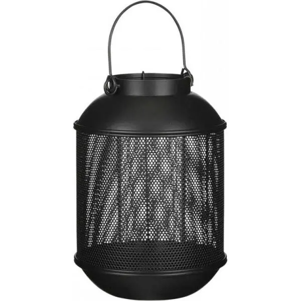 Deze metalen lantaarn is aan de binnenzijde voorzien van een transparante koker in plexiglas waarin je op een veilige manier een kaars kan plaatsen. De koker past in een metalen schaaltje die in de lantaarn hangt. Het kaarslicht schijnt doorheen de geperforeerde wand en creëert zo een uniek lichtspel op de ondergrond.