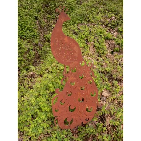 De pauw is gemaakt uit speciaal gevormd en behandeld metaal met een roestige look. Een origineel en gestileerd tweedimensionaal ornament.