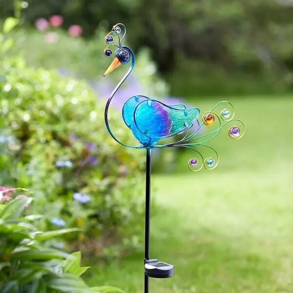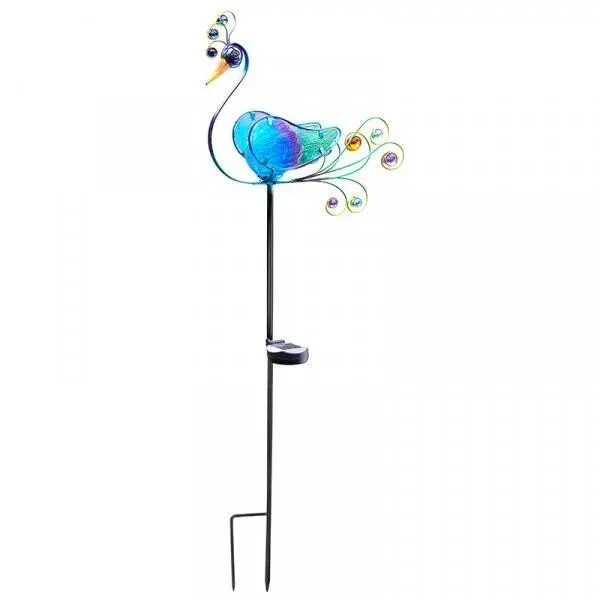 Pauwen zijn sierlijke vogels en zeker de mannetjes vallen op door hun bijzonder verenkleed. Deze unieke prikker fleurt de tuin of het terras meteen op, overdag door zijn opvallende kleuren, ’s avonds door de ingebouwde LED verlichting die de vogel nog extra accentueert.