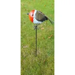 Prik het roodborstje met de bijgeleverde stok en grondpin in jouw border of plantenbak en geniet van zijn gezelschap.