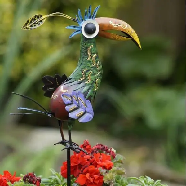 De toekan is voorzien van een prikker waarmee je de decoratie zowel in de plantenborder als in een bloembak kan prikken.