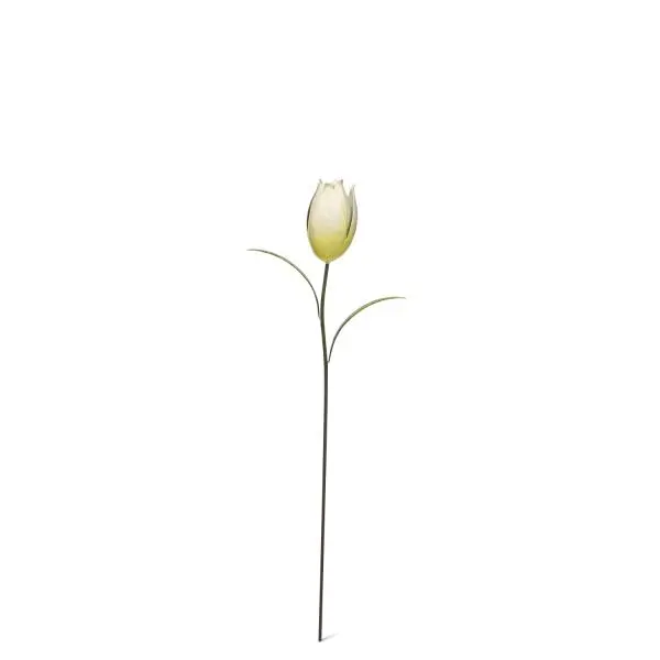 Fleurige tuinprikker van een kleurrijke tulp. De prikker is een vergrootte levensechte versie van een tulp, met twee groene blaadjes langs de stengel.
